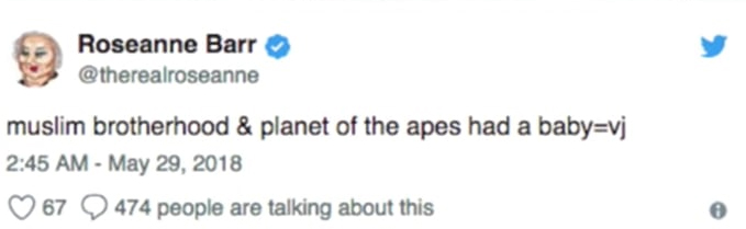 — Roseanne Barr (@therealroseanne) May 29, 2018