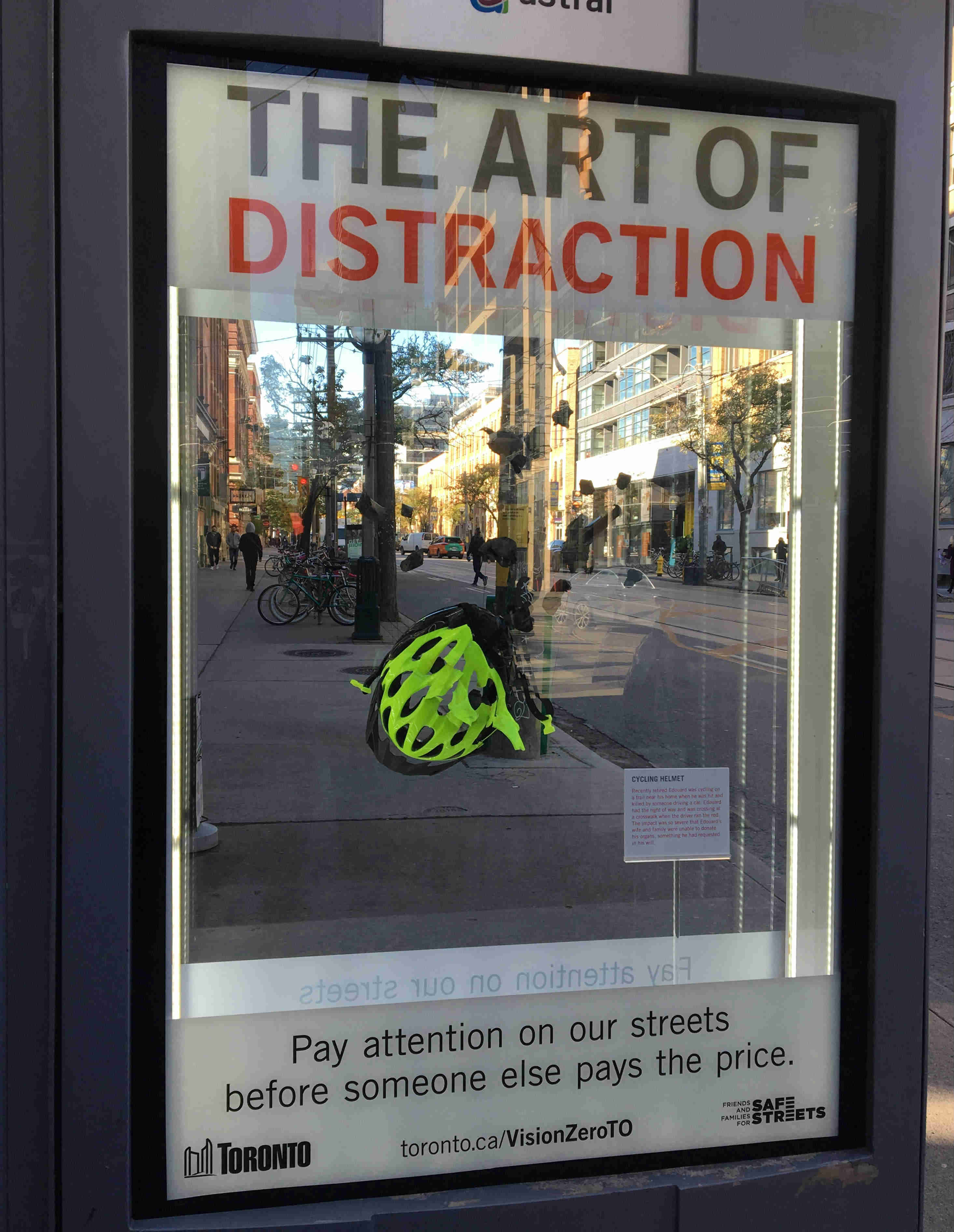 The public awareness campaign called 'Art of Distraction' puts personal items belonging to pedestrians and cyclists hit by vehicles or replicas of them on display at transit shelters, in print and television ads as well as social media posts. There is also a radio component to the campaign.