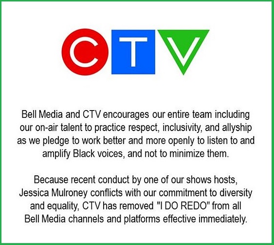 ``Because recent conduct by one of our shows hosts, Jessica Mulroney, conflicts with our commitment to diversity and equality, CTV has removed 'I Do, Redo' from all Bell Media channels and platforms effective immediately.''
