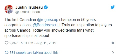 Prime Minister Justin Trudeau was among the many people to send their congratulations to the homegrown tennis star. He posted a message on Twitter.