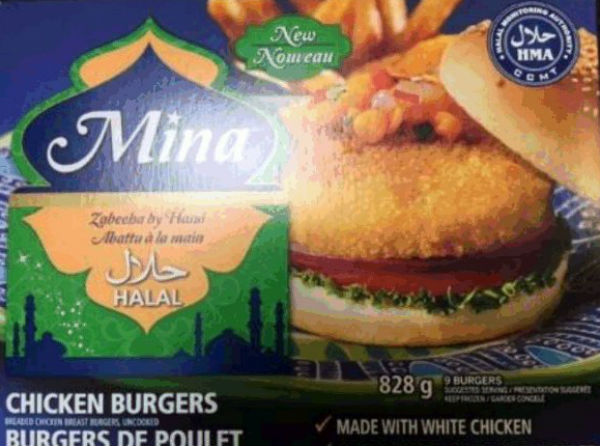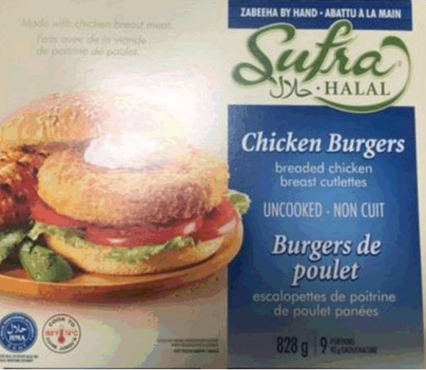Chicken burgers under the Sufra Halal and Mina Halal brand names in 828 gram packages are also being recalled.