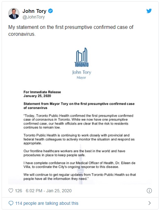Mayor John Tory issued a statement following today's announcement. He goes on to reassure the public that “health officials are clear that the risk to residents continues to remain low.”