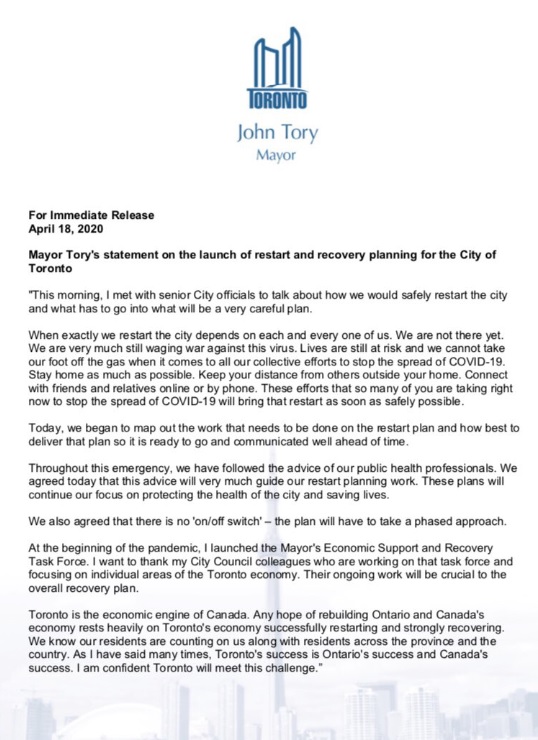 Mayor Tory released a statement via Twitter on the "launch of restart and recovery planning for the City of Toronto":