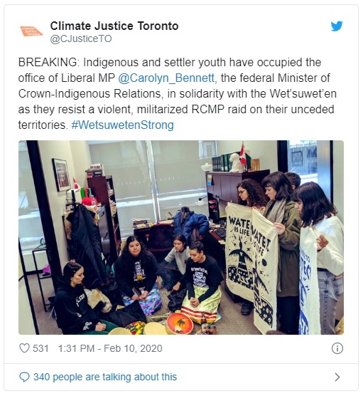 About two dozen protestors are occupying the Toronto office of the Federal Minister of Crown-Indigenous Relations, Carolyn Bennett.