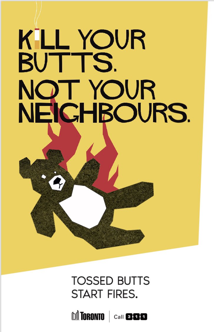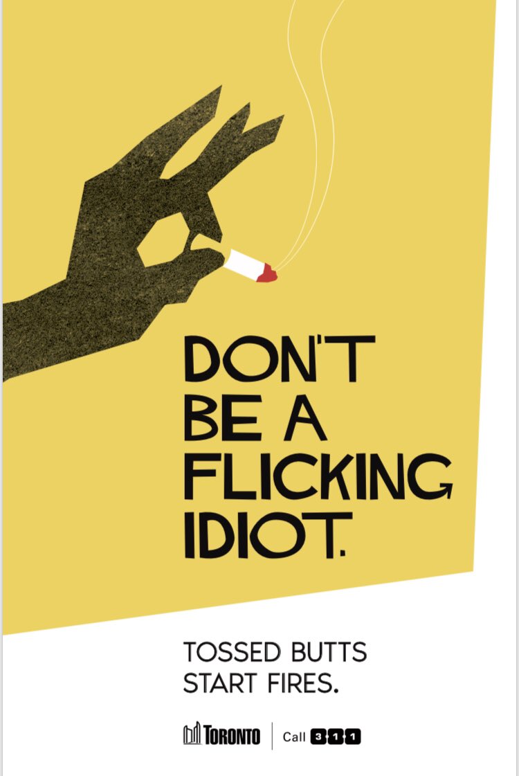 With posters that say "Don't be a flicking idiot" and "Kill your butts, not your neighbours", the campaign is aimed at people who don't stomp their cigarette butts before throwing them off their balcony.