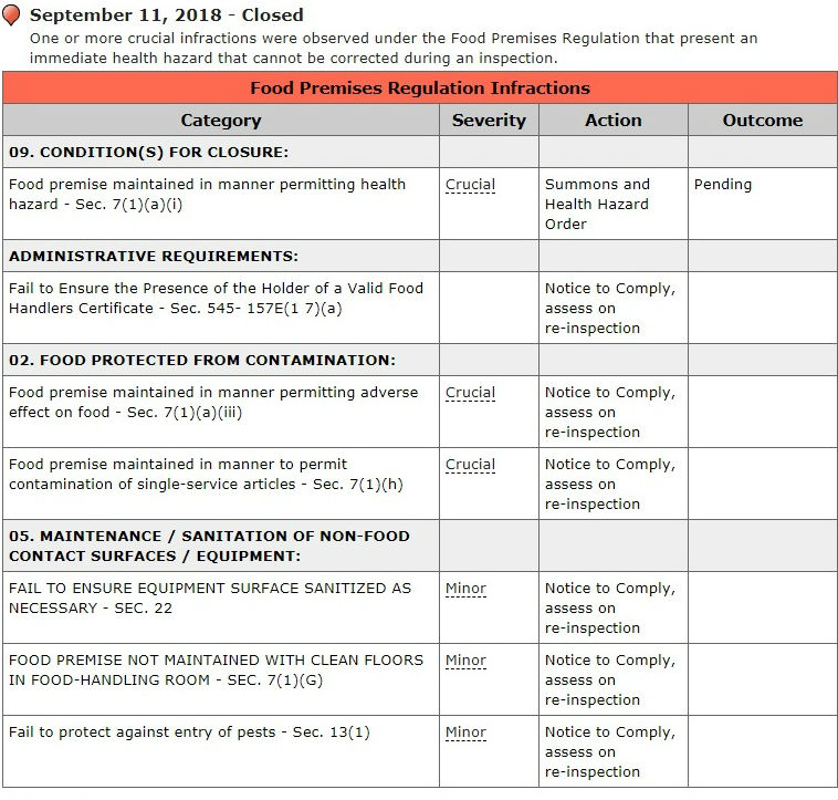 DineSafe inspection records show the outlet was closed September 11 for a series of "critical" infractions including "food premise maintained in manner permitting health hazard". It was cleared to re-open two days later and then closed again September 26 with you a new list of problems.