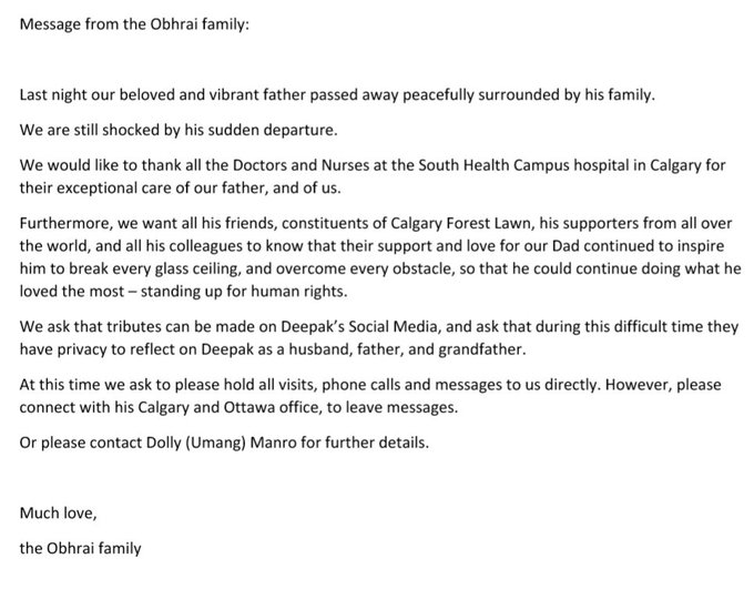 Obhrai was diagnosed a few weeks prior with stage 4 liver cancer in Calgary. Relatives said in a release that they were "shocked by his sudden departure."