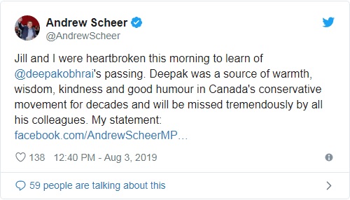 "Deepak was a constant source of joy inside the Conservative caucus," said a statement from a "heartbroken" leader Andrew Scheer, with whom Obhrai shared the battle to lead the party in 2016 and 2017.