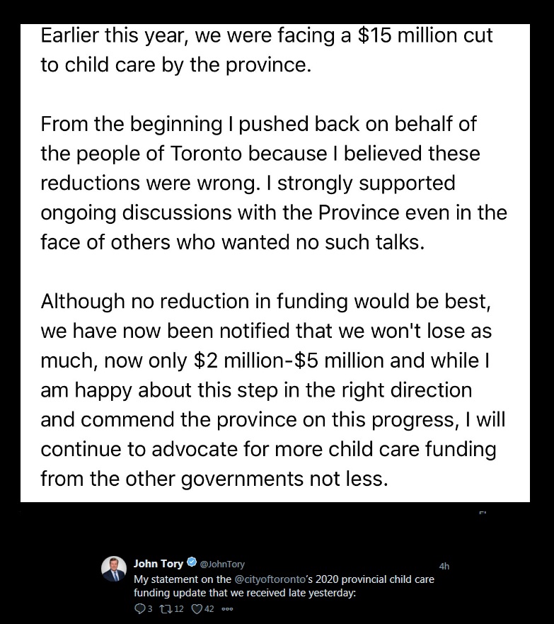 Planned childcare cuts by the Ford Government are being reduced by at least two thirds. That's according to Mayor John Tory, who tweeted out the following statement this morning: