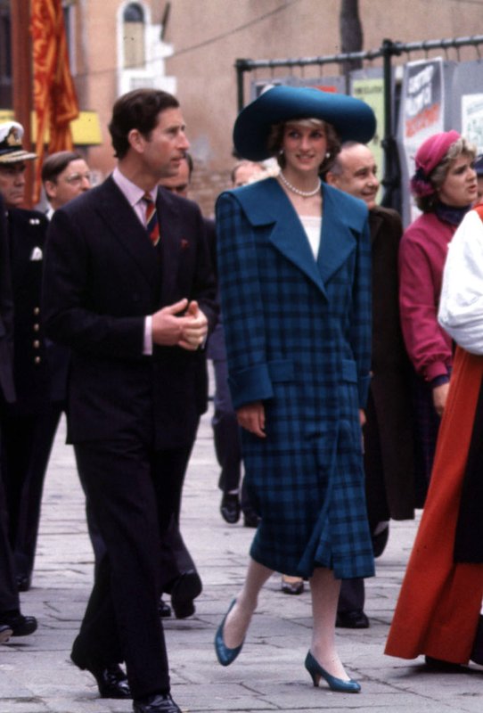 Diana turned to Emanuel, designer of her wedding gown, for a 1985 official royal visit to Italy. A coat and skirt in green, blue and black was cut in the boxy shape in favour at the time.