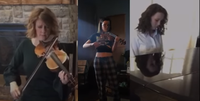 Natalie MacMaster playing alongside the online performance of Emily Tuck for the Nova Scotia Remembers special, accompanied by her daughter (right).
