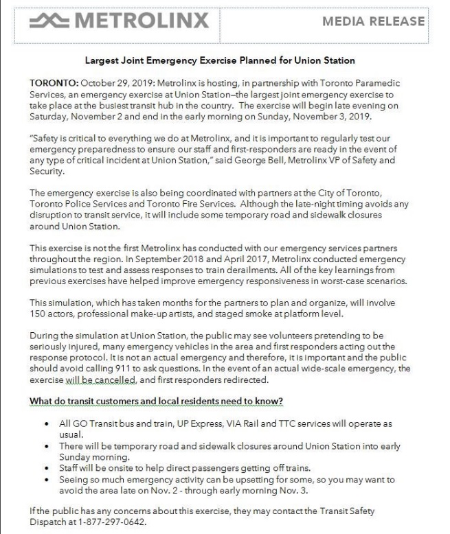 Metrolinx goes on to tell the Star that they want to notify the public about the emergency exercise in order to reduce the number of "concerned 911 calls".