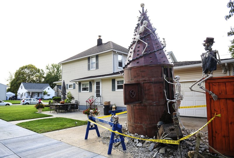 In Lorain, Ricky Rodriguez and his wife built what looks like a massive digging machine poking up through their driveway, surrounded by rock debris and skeletons. Rodriguez tells The Chronicle-Telegram that it’s made of wood and took six weeks to create.