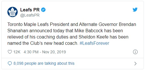 "Mike's commitment and tireless work ethic has put our organization in a better place and we are extremely grateful and appreciative of the foundation he has helped us build here. At this time, we collectively felt that it was best to make a change to Sheldon Keefe.''