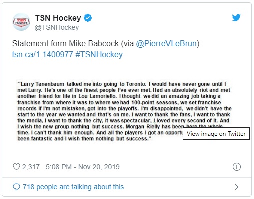 Meanwhile, Babcock issued a statement via Twitter, after news broke that he was let go: