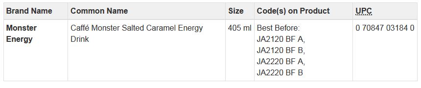 The Canadian Food Inspection Agency has announced a nationwide recall of Caffé Monster Salted Caramel Energy Drink, because they may contain pieces of glass.