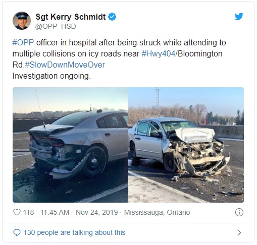 Fortunately, an OPP officer struck while responding to multiple collisions due to icy roads, near highway 404 and Bloomington Road in Aurora, will be okay.