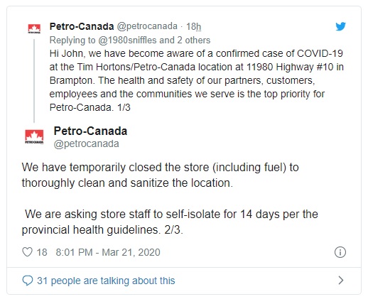 Petro-Canada is letting the public know that an employee who works at one of their locations in Brampton has tested positive for the coronavirus.