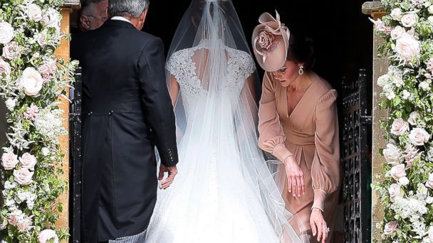 Middleton came to the church accompanied by her father Michael in a vintage convertible. She wore a custom wedding gown designed by Giles Deacon, a long veil by prominent hat-maker Stephen Jones, and a tiara.