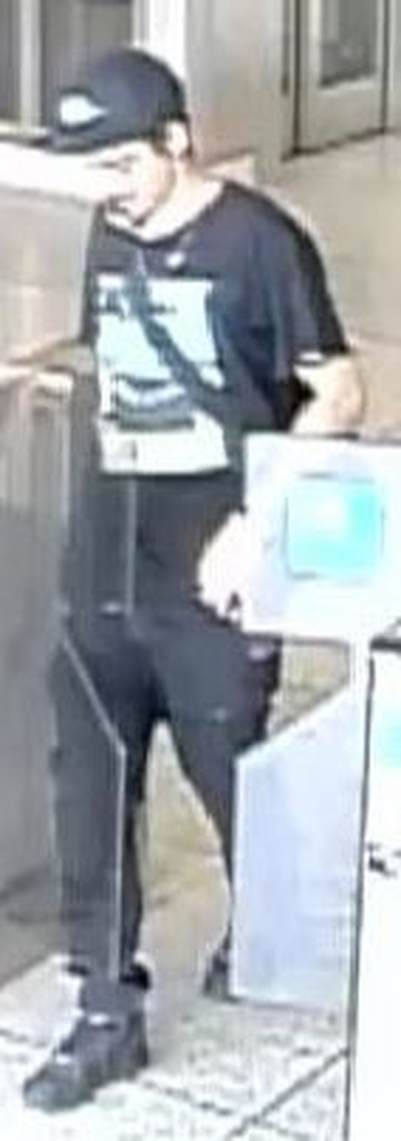 The suspect is described as 5', medium build, short black hair, black moustache, black chin hair. He was last seen wearing a black short-sleeved shirt, black jeans, black high-top shoes, carrying a black side-satchel gym bag.