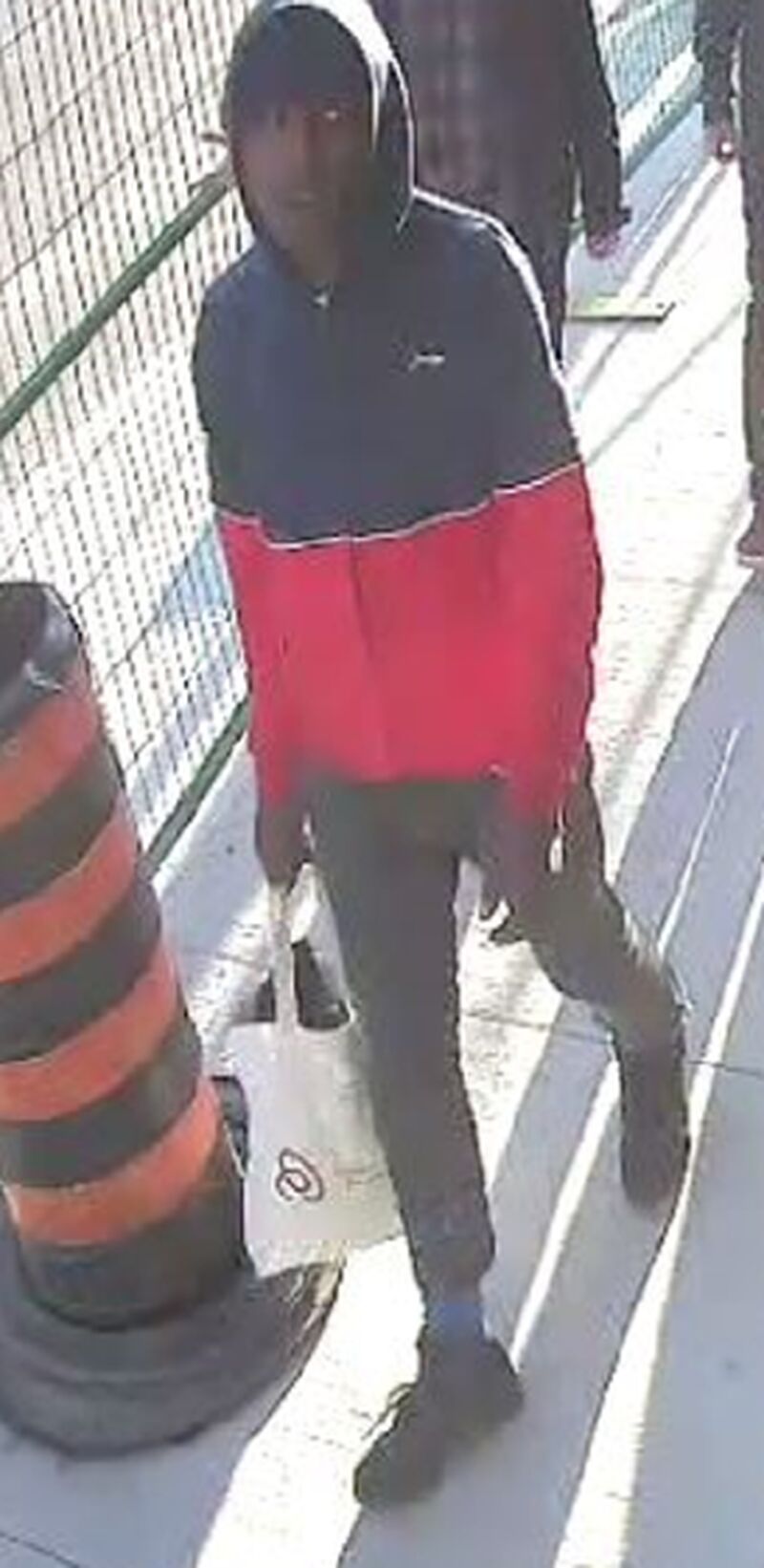 Police describe the man as 6'0" with a thin build, wearing a dark toque, two-toned hooded sweater, dark pants, dark shoes, and carrying a white bag at the time of the incident.