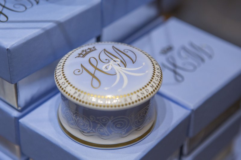 The approved commemorative china marking the couple’s May 19 wedding went on sale Friday.