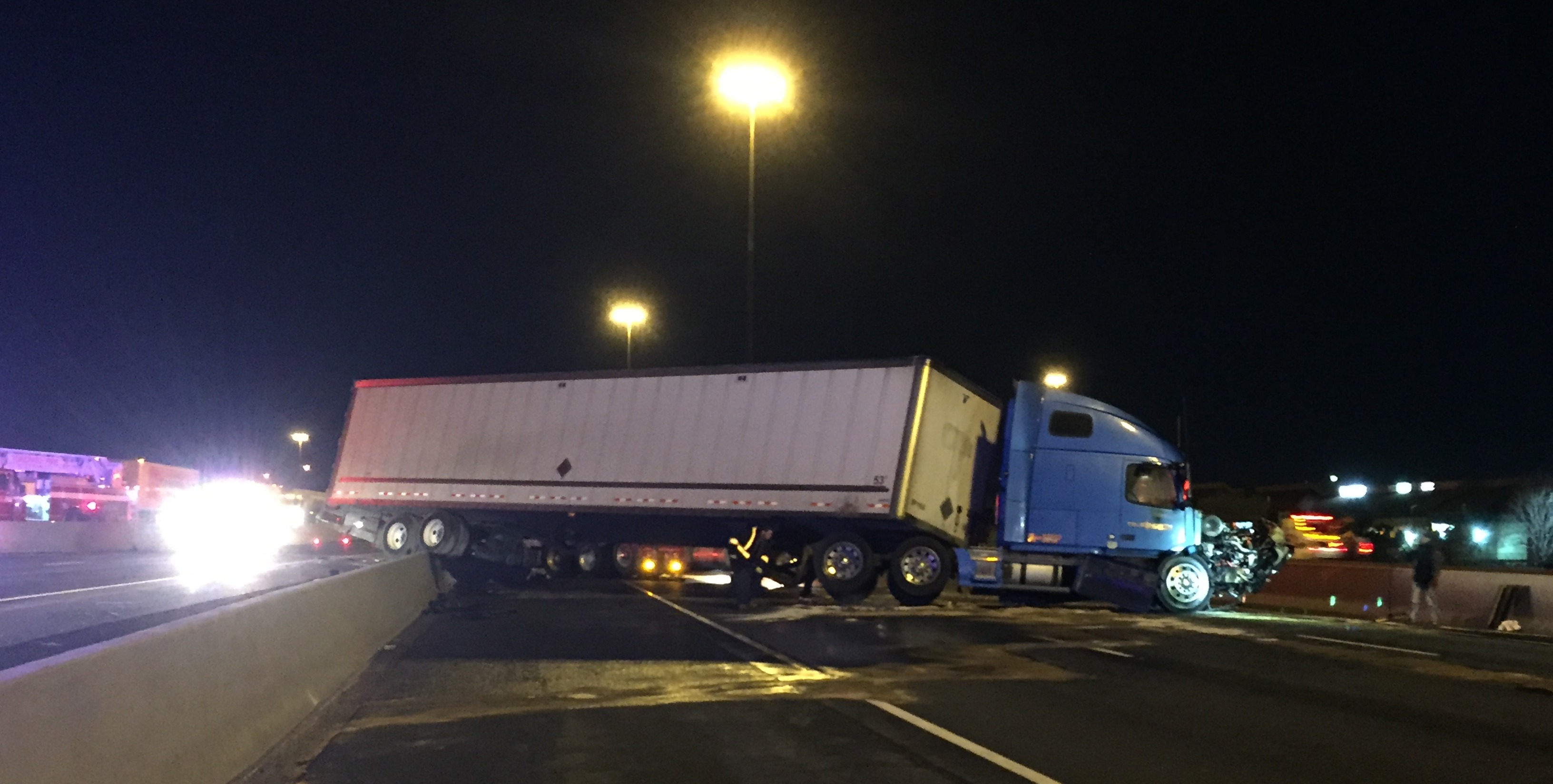 It's not clear why, but a tractor trailer jackknifed in the highway's eastbound express lanes near Port Union at about 1 a.m. Wednesday, ending up with its rear wheels balancing on the median.
