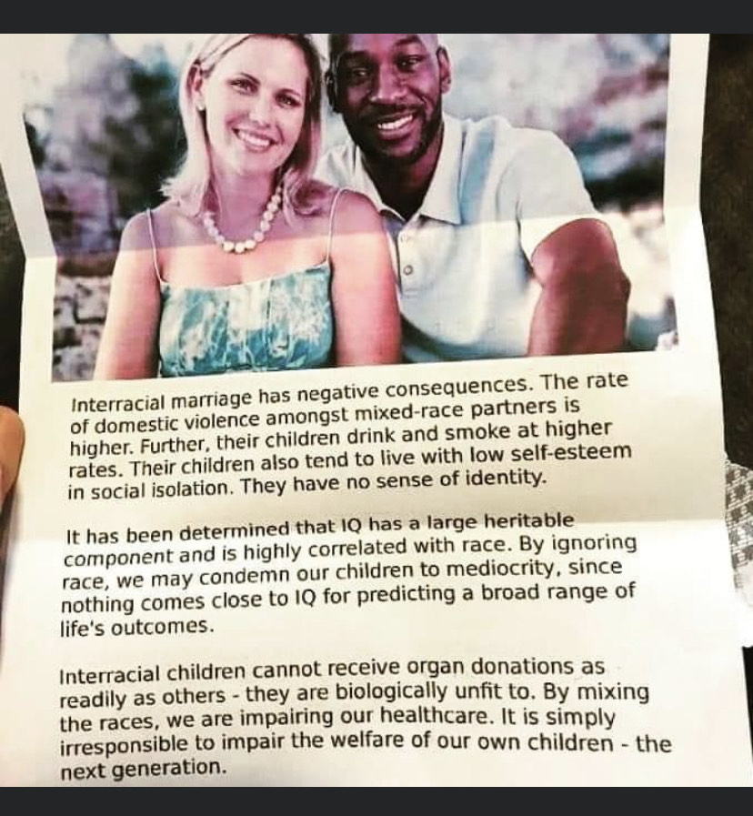 The pamphlets appear to have been left in mailboxes of several residents in that area, and features a writeup that attacks interracial marriage.