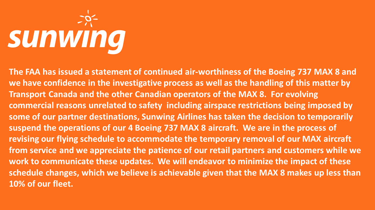 Sunwing Airlines is grounding its fleet of Boeing 737 Max 8 aircrafts, the first of the Canadian airlines to make such a move.