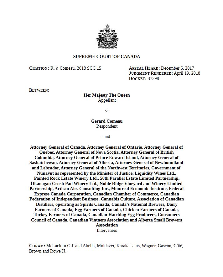 The trial judge accepted Comeau's argument the Liquor Control Act provision amounted to a trade barrier that violated Section 121 of the Constitution Act, 1867.