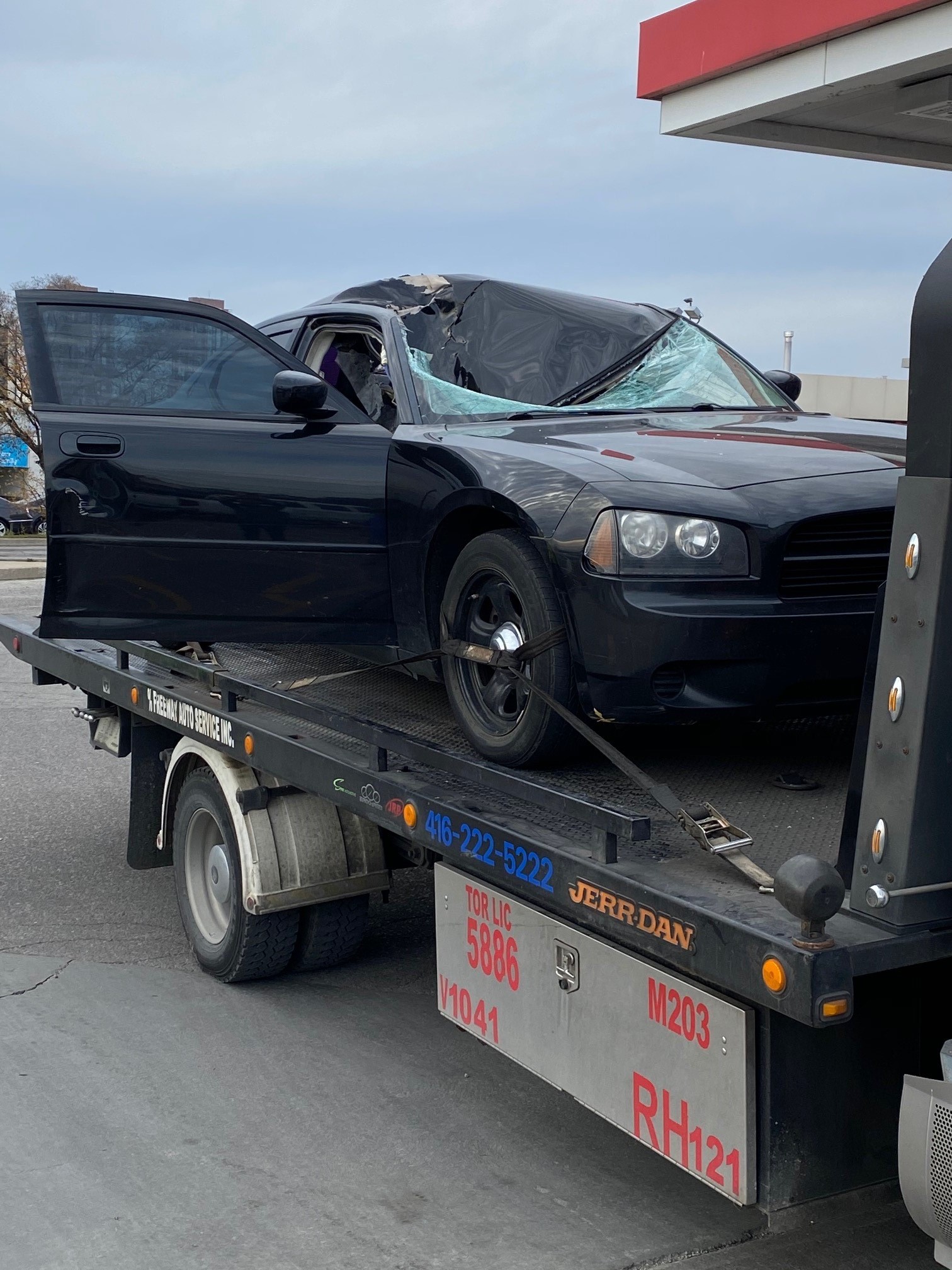 "I pretty much had to avoid it by ducking under the dash and moving to the left," says Greg Olders, whose Dodge Charger was mangled by the wheel.