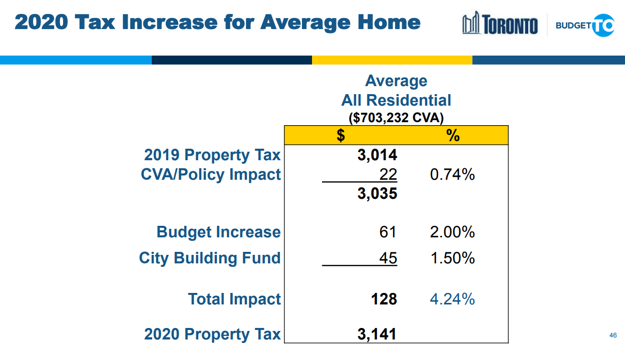 With a property tax increase below the rate of inflation ($61), the new City Building Fund ($45) and the CVA policy impact, which primarily includes the city's education levy (22), the average home is looking at an increase of $128, which works out to $10.60 per month.