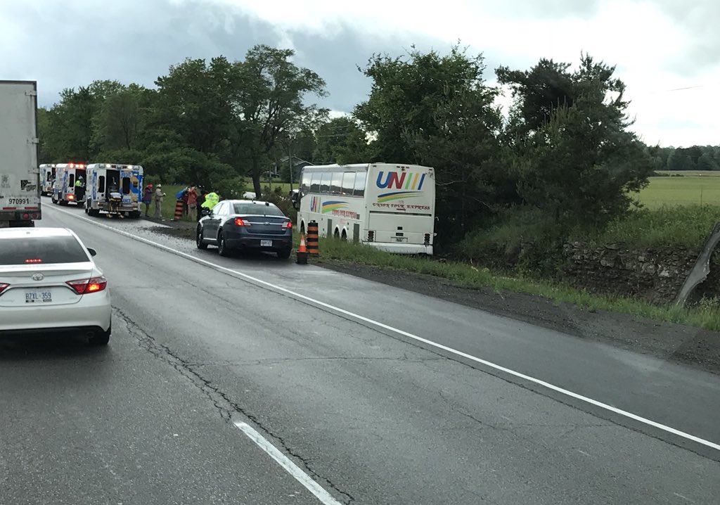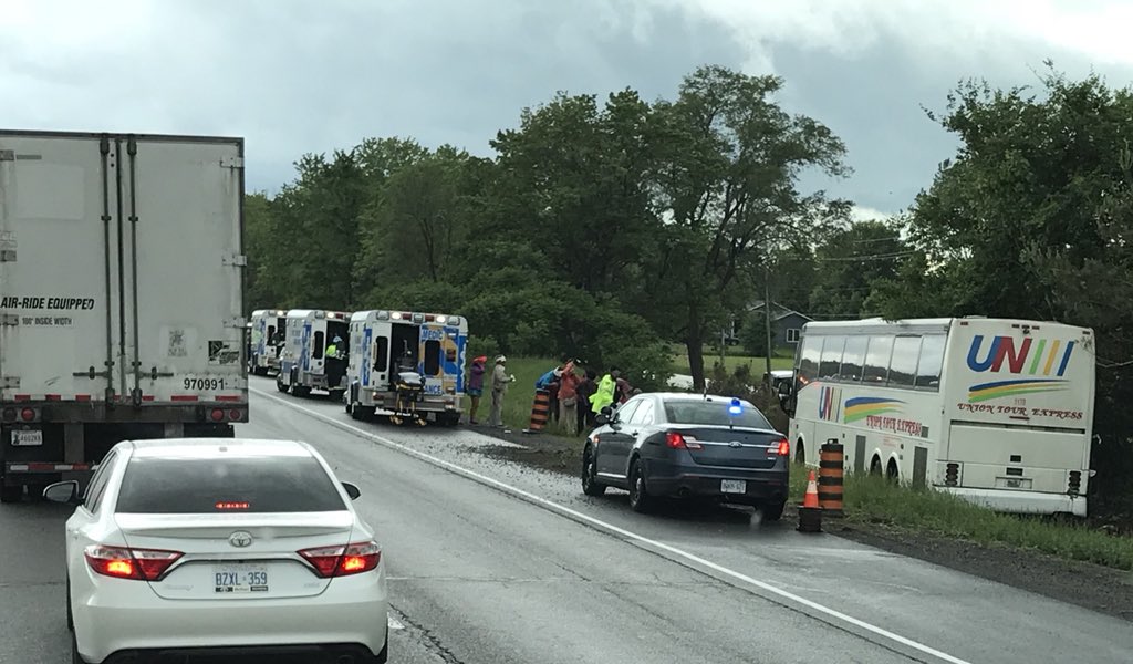 Viewer video from the scene of bus crash on Hwy. 401 near Prescott . Ornge ambulance responding. Initial reports of 30-40 injured. @ctvottawa pic.twitter.com/G082nVmKnV