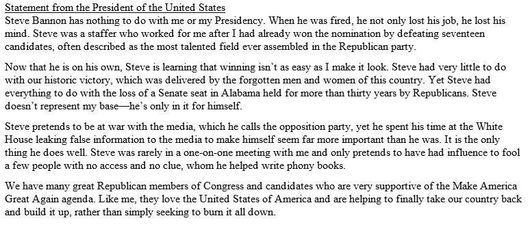Trump says in the statement Wednesday that when Steve Bannon was fired, “he not only lost his job, he lost his mind.”