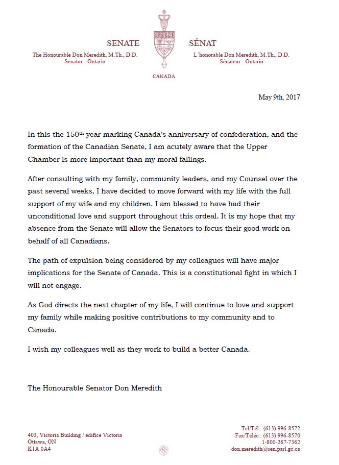 Disgraced Sen. Don Meredith is resigning from the Senate rather than wait to see if his colleagues expel him for engaging in a sexual relationship with a teenage girl.