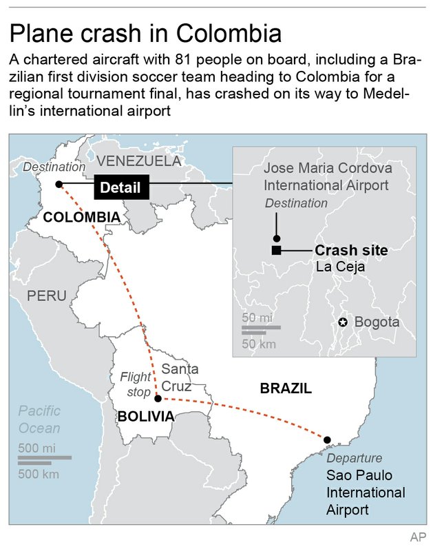 Bolivia's civil aviation agency said the aircraft picked up the Brazilian team in Santa Cruz, where players had arrived earlier in the day on a commercial flight from Sao Paulo, Brazil. Spokesman Cesar Torrico said that the plane underwent an inspection before departing for Colombia and reported no problems.
