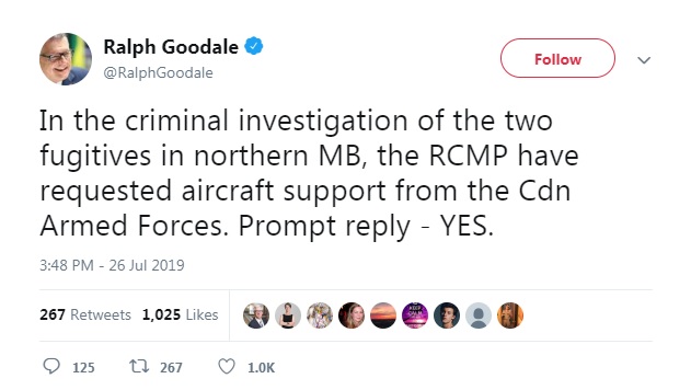 Earlier in the day, Public Safety Minister Ralph Goodale tweeted that the military would be giving the Mounties air support in combing the terrain around Gillam, Manitoba.