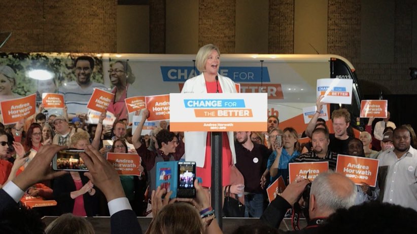 The N-D-P under Andrea Horwath will form the Official Opposition, marking a turnaround for a party consistently stuck in third place since Bob Rae's New Democratic government was defeated in 1995.