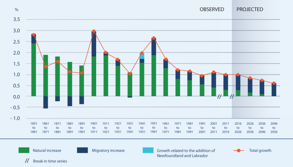 Statistics Canada projections suggest natural, fertility-fuelled growth will decline in the coming years, thanks to an aging population and a declining birth rate, to less than one per cent, making migration by far the dominant source of growth by 2056.