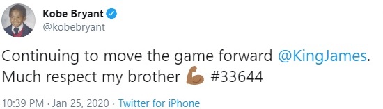 “Continuing to move the game forward (at)KingJames,” Bryant wrote in his last tweet. “Much respect my brother.”