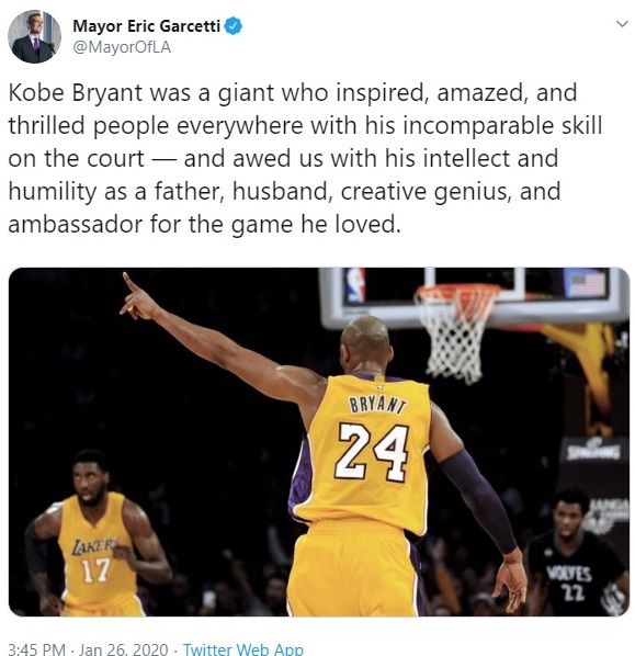 “Kobe Bryant was a giant who inspired, amazed, and thrilled people everywhere with his incomparable skill on the court — and awed us with his intellect and humility as a father, husband, creative genius, and ambassador for the game he loved. He will live forever in the heart of Los Angeles, and will be remembered through the ages as one of our greatest heroes,” Los Angeles Mayor Eric Garcetti said.