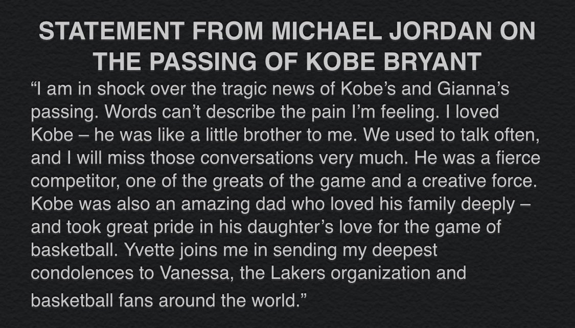 “Words can’t describe the pain I am feeling. I loved Kobe — he was like a little brother to me,” retired NBA great Michael Jordan said. “We used to talk often, and I will miss those conversations very much. He was a fierce competitor, one of the greats of the game and a creative force.”