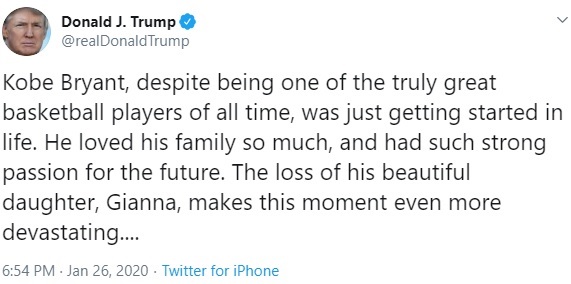 President Donald Trump tweeted condolences to Bryant’s family, saying that “despite being one of the truly great basketball players of all time, (Bryant) was just getting started in life.”