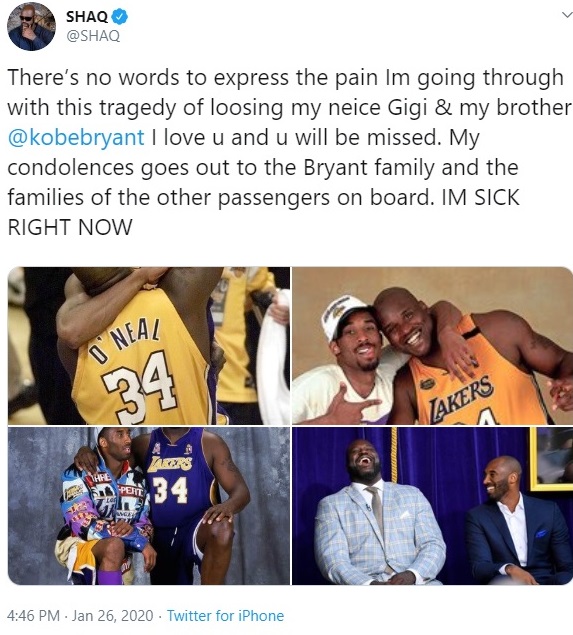 “There’s no words to express the pain Im going through,” O’Neal tweeted. Sunday. “(at)kobebryant I love u and u will be missed. ... IM SICK RIGHT NOW.”