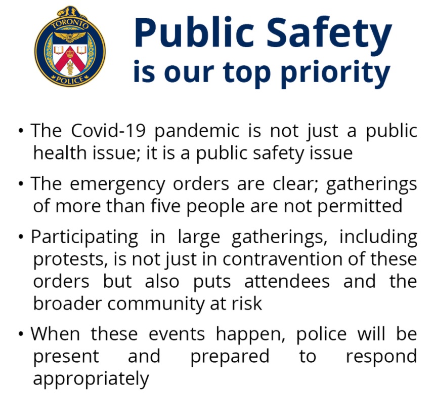 In a news release, issued late Saturday, the Toronto Police Service warned it will continue to respond to calls about large gatherings and will take steps to disperse any crowds. They will also issue tickets and summonses to anyone "when there is evidence of non-compliance of the provincial order under the Emergency Management and Civil Protection Act (EMCPA) or the Reopening Ontario Act (ROA)".