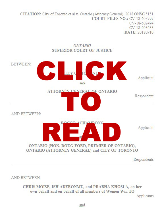 "There is no evidence that any other options or approaches were considered or that any consultation ever took place," Belobaba wrote. "It appears that Bill 5 was hurriedly enacted to take effect in the middle of the city’s election without much thought at all, more out of pique than principle."