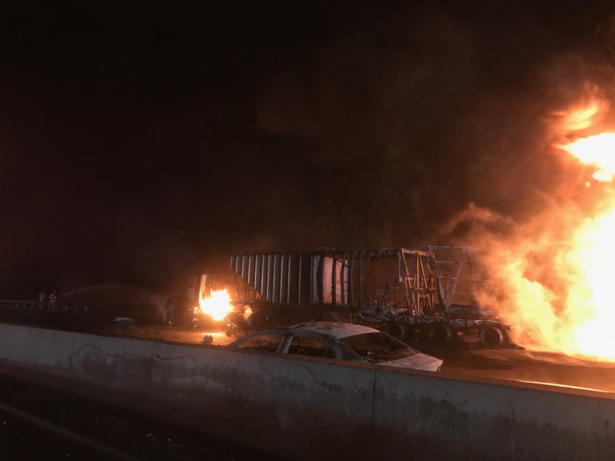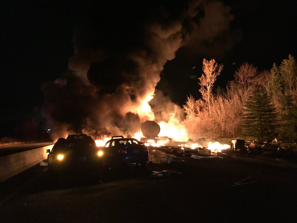 Tuesday night's crash involved two tanker trucks and three transport trucks. The impact sent fireballs and booming explosions into the sky.