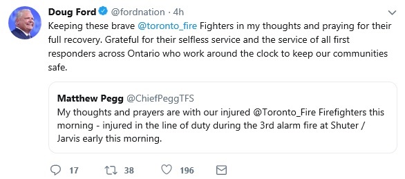 Meanwhile, Premier Doug Ford among the many extending their best wishes to the injured firefighters. Ford sent out a tweet this morning: