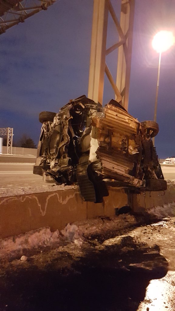 Jaw-dropping photos from the scene show the vehicle almost completely wrapped around a post supporting a highway sign and nearly sliced in half.