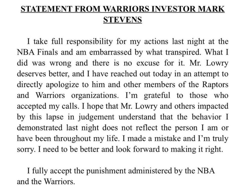 “Mr. Stevens’ behavior last night did not reflect the high standard that we hope to exemplify as an organization,” the Warriors said in a release. “We’re extremely disappointed in his actions and, along with Mr. Stevens, offer our sincere apology to Kyle Lowry and the Toronto Raptors organization for this unfortunate misconduct.”